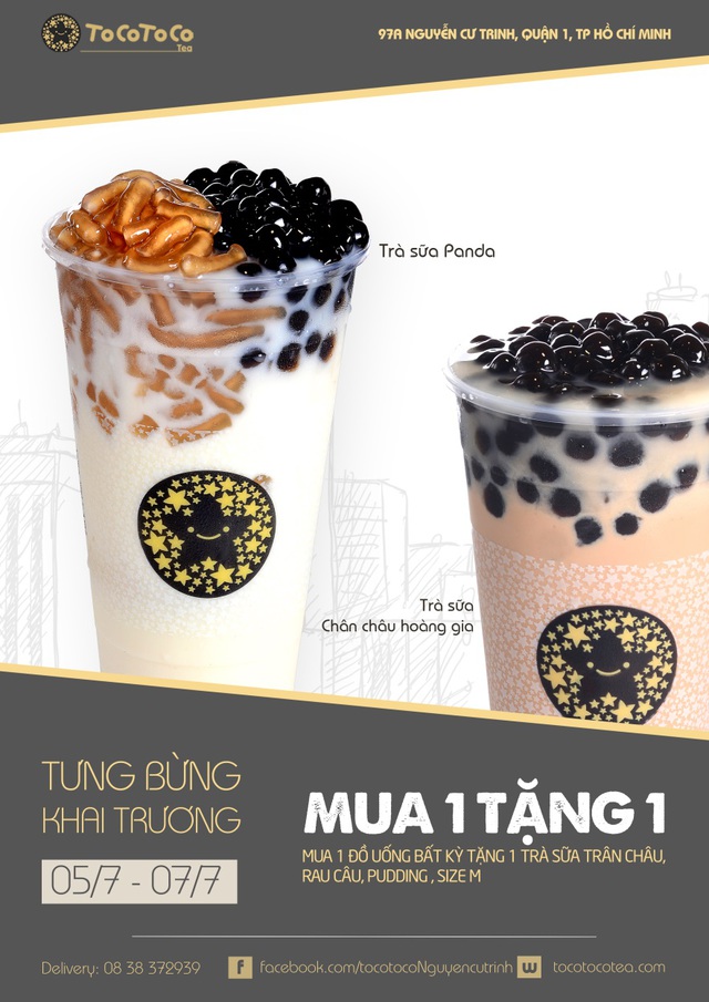 Nằm ở một trong những con đường sầm uất nhất TP.HCM, TocoToco số 97A Nguyễn Cư Trinh, phường Nguyễn Cư Trinh, Quận 1 mang một hồn nét riêng trong văn hóa ẩm thực. Và chắc chắn rằng, bất cứ ai đã từng biết, từng nghe nói về ẩm thực chốn Hà thành sẽ bị “đổ rụp” trước hương vị trà sữa mà TocoToco mang lại. Đừng quên, từ ngày 5 - 7/7/2017, tại đây sẽ có chương trình khuyến mại siêu hot “MUA 1 TẶNG 1” nhân dịp khai trương, bạn nhé!