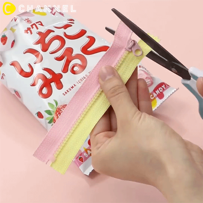 - Cắt đi phần thừa của chiếc khoá kéo sao cho độ dài còn lại bằng miệng của túi kẹo.