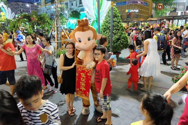 Tại phố đi bộ Nguyễn Huệ, nhiều trẻ em háo hức chụp ảnh cùng các chú khỉ - (Ảnh: Tứ Quý)