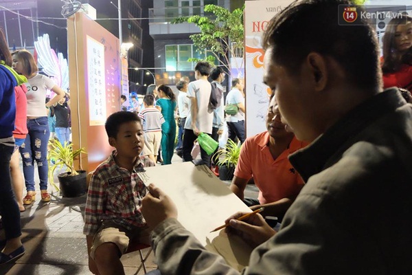 Không khí tết trước giờ bắn pháo hoa. Ngay tại nhà văn hoá thanh niên đường Phạm Ngọc Thạch quận 1, ông đồ đang viết chữ cho khách hàng - (Ảnh: Thạch Nguyễn)
