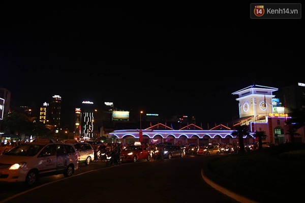 Trước chợ Bến Thành dòng xe nối đuôi nhau ngày một đông để đến địa điểm xem pháo hoa giao thừa - (Ảnh: Quỳnh Trân)