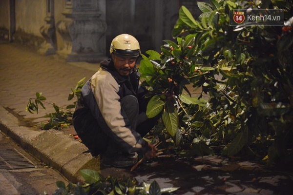 Bác Cường 56 tuổi đang chuẩn bị những bó hoa Hải Đường để bán cho những người đi chơi giao thừa tại chùa Kim Sơn trên đường Kim Mã - (Ảnh: Phương Thảo)