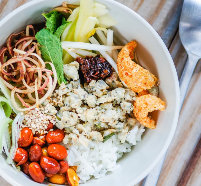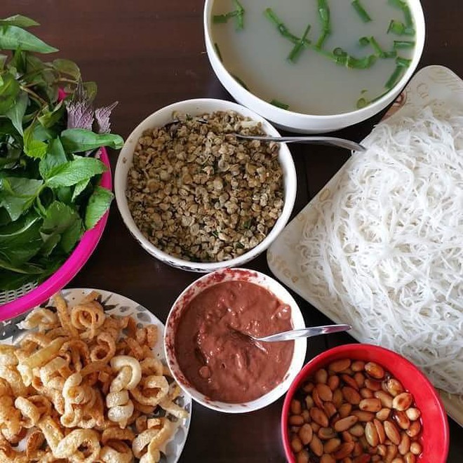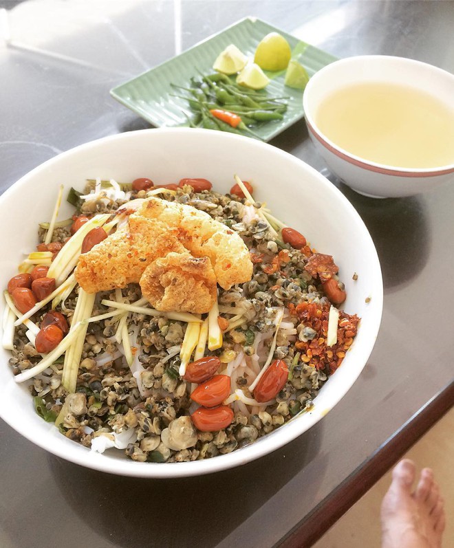 Tiếp đến, người bán sẽ xúc từng thìa hến luộc thơm phức đặt bên trên, cho vài thìa đậu phộng nguyên hạt ngâm dầu điều, thêm ớt sa tế cay nồng và vài miếng da heo chiên giòn. Đặt tô bún hến đầy ắp thức ăn lên bàn cùng chén mắm ruốc Huế đậm vị, vừa hấp dẫn thị giác, vừa hít hà mùi thơm dân dã đã khiến chúng ta sôi bụng thòm thèm lắm rồi.